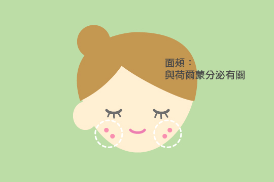 2. 面頰暗瘡:與荷爾蒙分泌及女士經期有關。